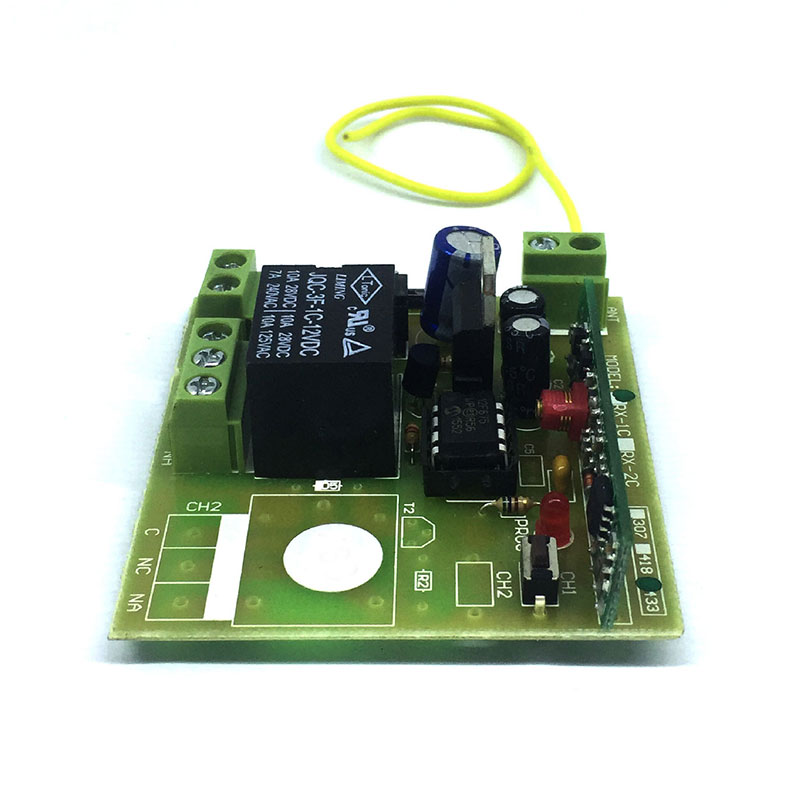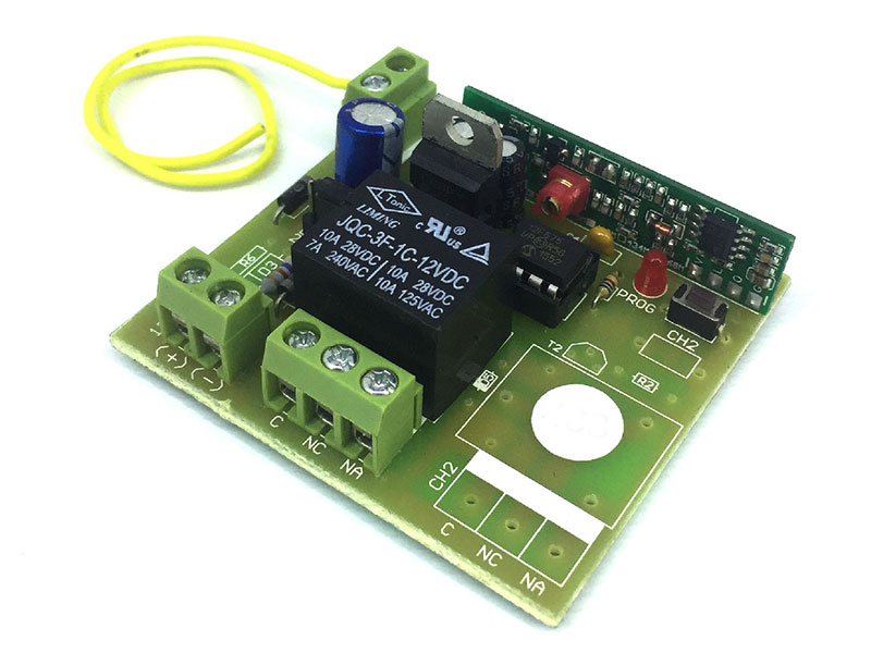 Receptor universal 1 canal multi-code, con posibilidad de conexión adaptable a diferentes electrónicas del mercado, alimentación de 12v/24v, tanto en corriente alterna como en corriente continua. Capacidad de grabación de transmisores de 40 unidades (botones). Programable en modalidad seguidor o retenido.